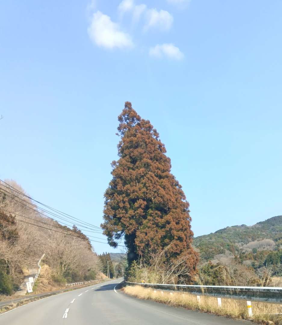 営業で山道を走っていたら、目の前にスギノ木が…。