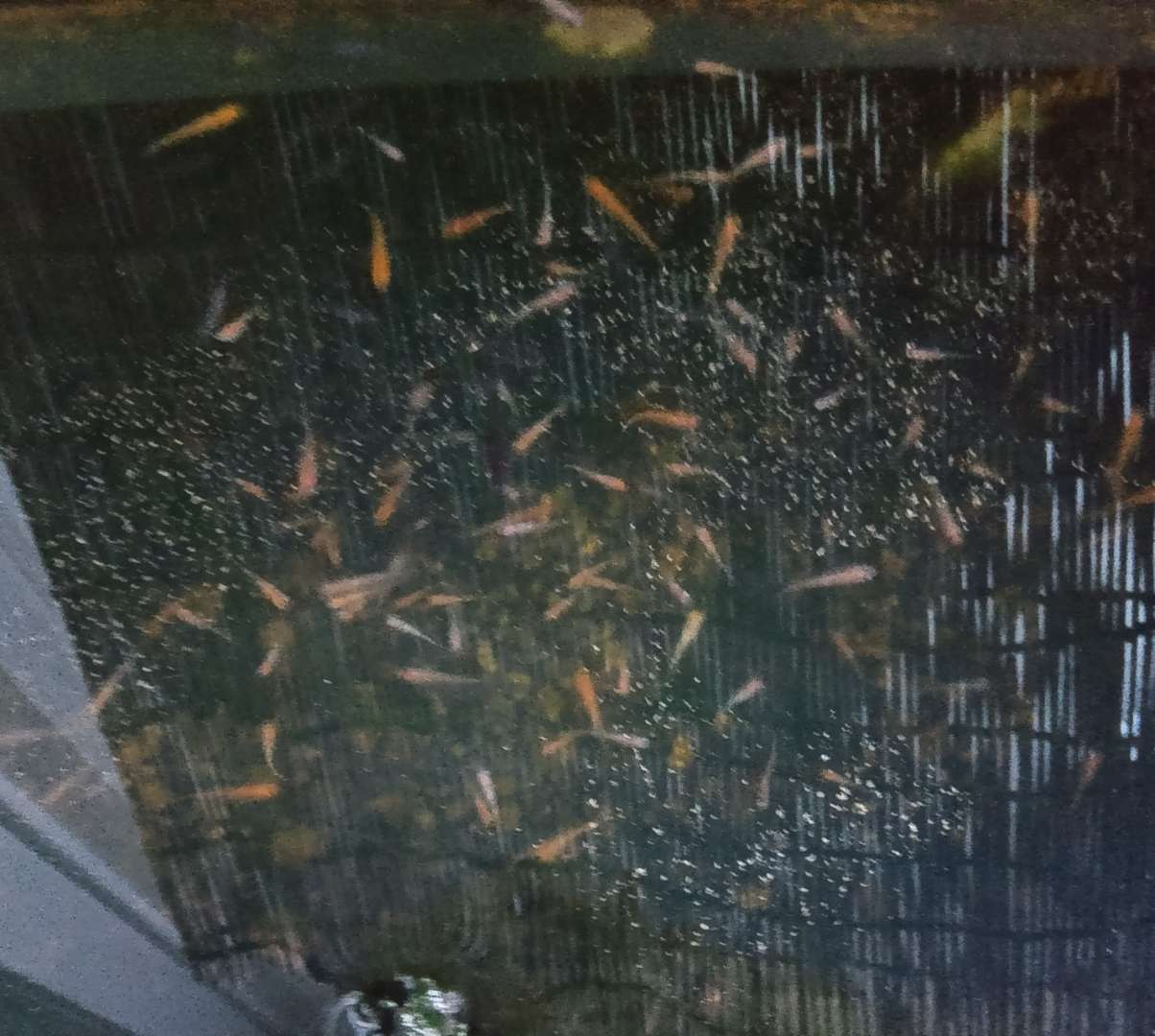 やわらかい日差しが水面にきらきらと反射して、その中をメダカちゃんたちがすいすい泳いでいます。